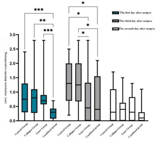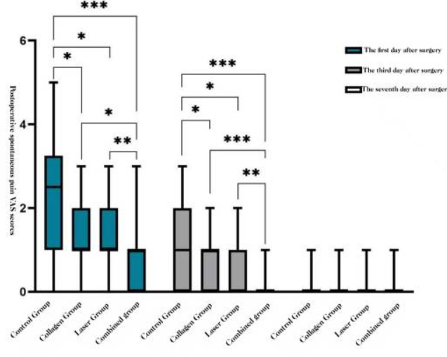 As you can see, the pain levels in the combined group (collagen + lasers) is by far the lowest. The combined group especially outperforms all other groups 1 and 3 days after surgery, but not at day 7 as all pain has disappeared for all groups at that point.
