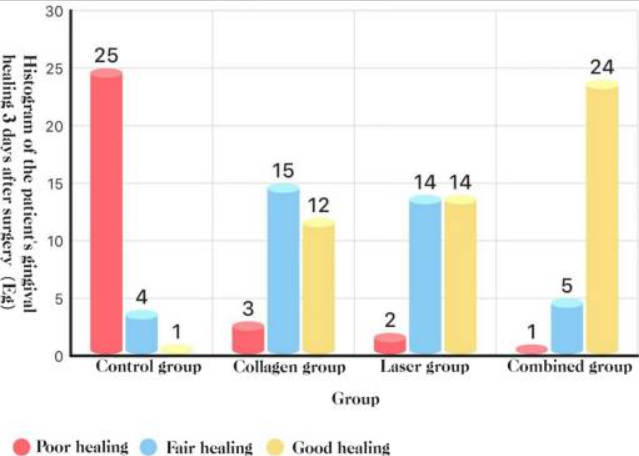 The collagen+laser group does best especially at day 1 and day 7, post-surgery. Then, there's the healing process itself, which once again is best in the combined collagen+laser group: