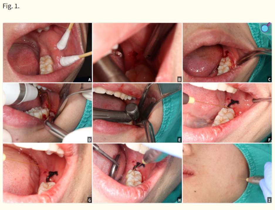 In this study, the researchers used Er:YAG (2,940 nm) and Nd:YAG lasers (1,064 nm). Now, what's maybe harder to conceive for people is that the 2,940 nm laser is primarily used for surgical purposes, here, for making incisions into the soft tissue. You can see that incision being made in Figure 1 below, in picture B and C:
