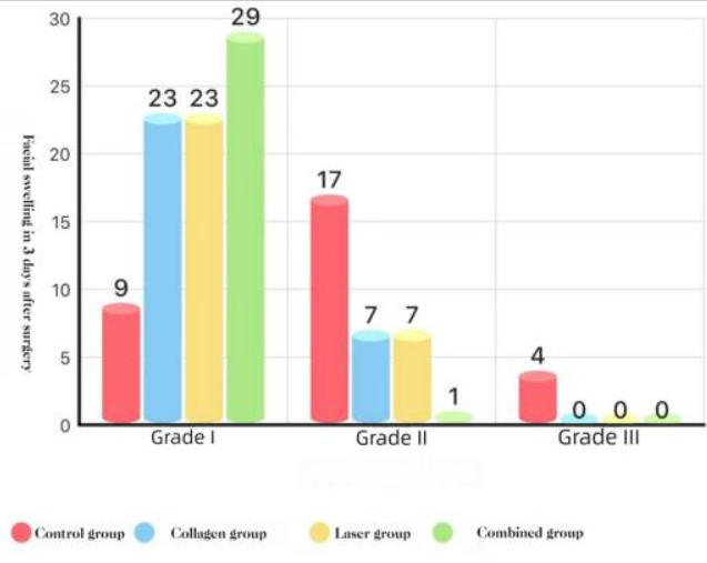 Grade II is moderate swelling, and Grade III is quite severe swelling, and both outcomes are absent in the combined collagen+laser group. So overall, here, the laser and collagen combination group does best once again. The picture above shows the swelling 3 days after the sugergy.